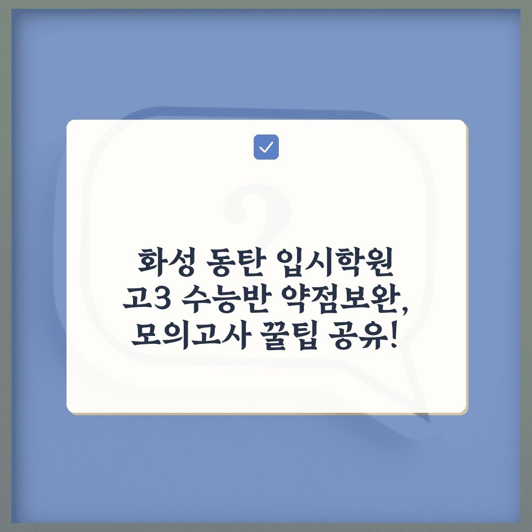 ## 메타 설명 (80-100자) 화성 동탄 고3 수능반 전문 입시학원에서 약점보완 및 모의고사 꿀팁을 공유합니다. 수능 성적 향상을 위한 전략을 확인하고 합격의 기회를 잡으세요!